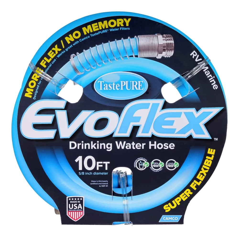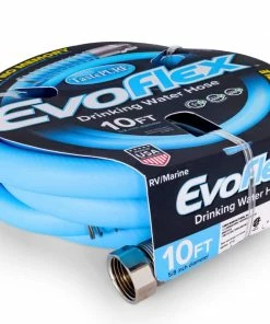 - Camco’s Evo Flex 10 ft. Drinking Water Hose with 5/8″ ID is ideal for RV and marine use