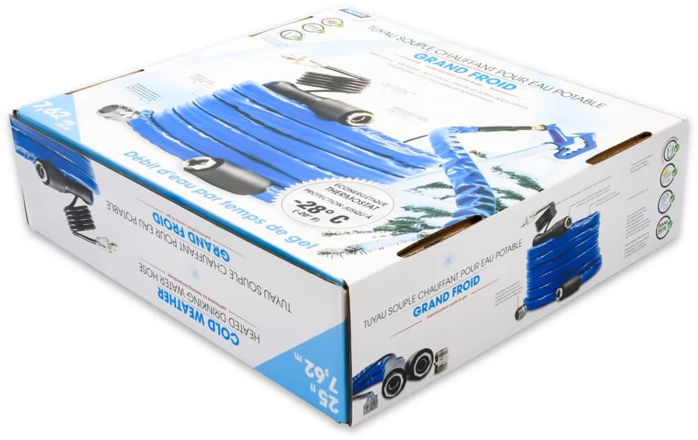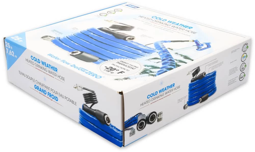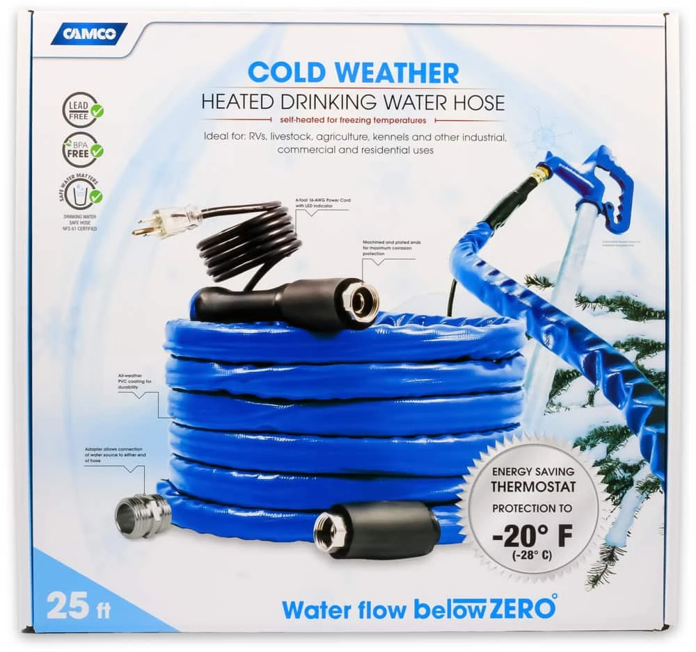 - Camco Cold Temperature Heated Drinking Water Hose provides fresh water freeze protection for up to -20ºC (-4ºF) degrees for RV-ing, marine, camping and livestock