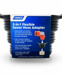 - Camco 3-in-1 Flexible Sewer Adapter is a black, flexible fitting that makes connection to a sewer inlet easier and less hands-on, even when the inlet threading is stripped or dirty