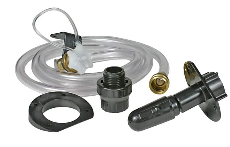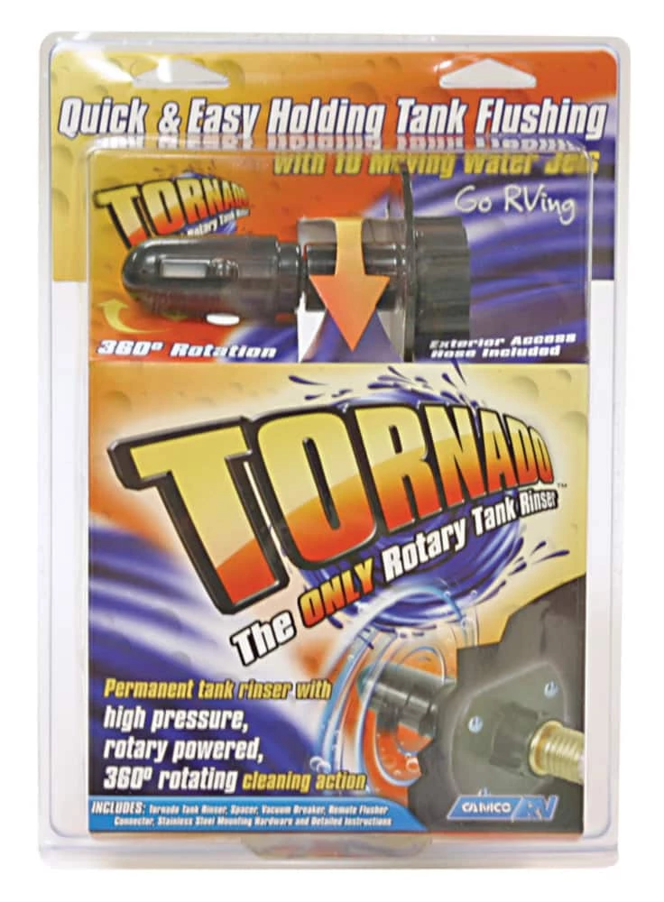 - Camco RV 360 Holding Tank Tornado Rinse Kit provides an exterior hose connection and direct line to the holding tank