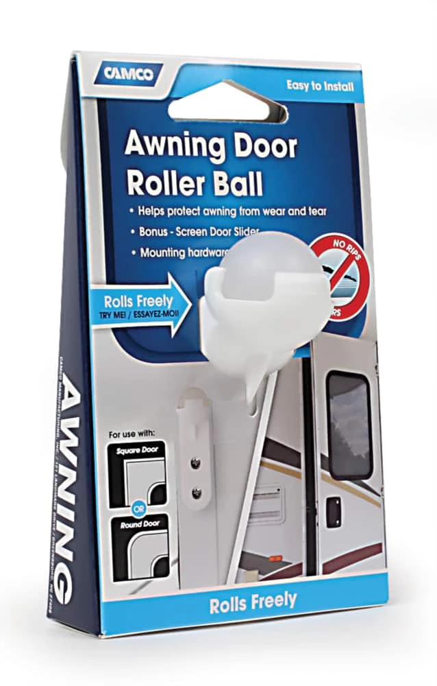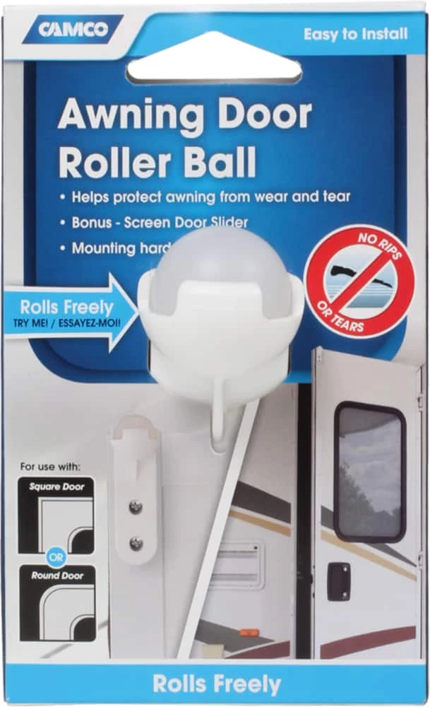 - Camco RV Door Roller Ball Awning Protector prevents awning damage from screen door corners catching and tearing fabric awnings while opening