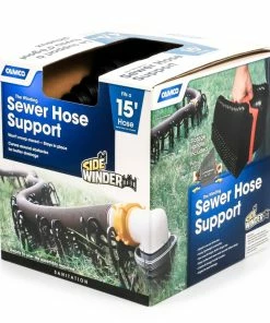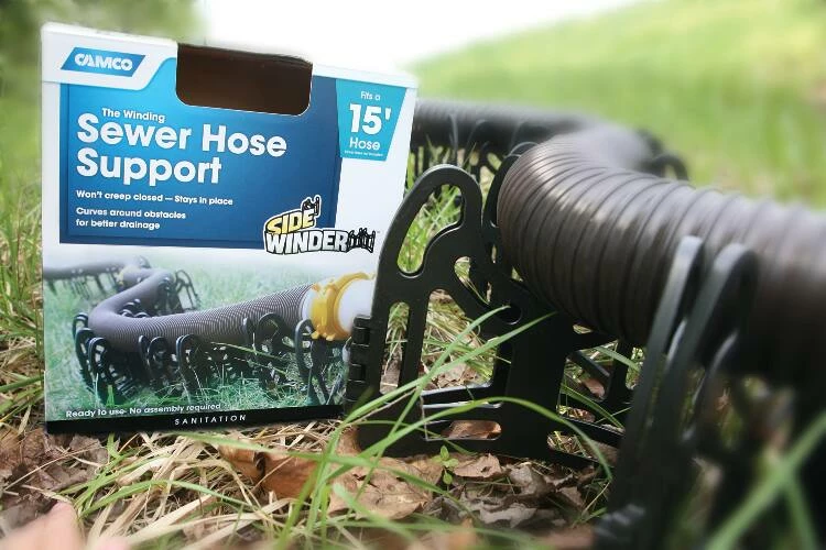 - 15′ (4.6 m) Sidewinder sewer hose support has sturdy, lightweight plastic support with strong snap-fit hinges that have deep cradles to hold sewer hose in place without straps