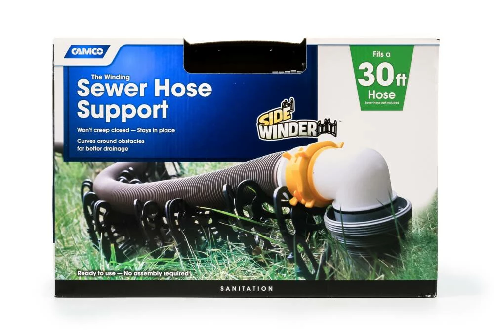 - Camco RV Sidewinder Sewer Hose Support features a sturdy, lightweight sewer hose support for proper drainage slope and reliable pump-out