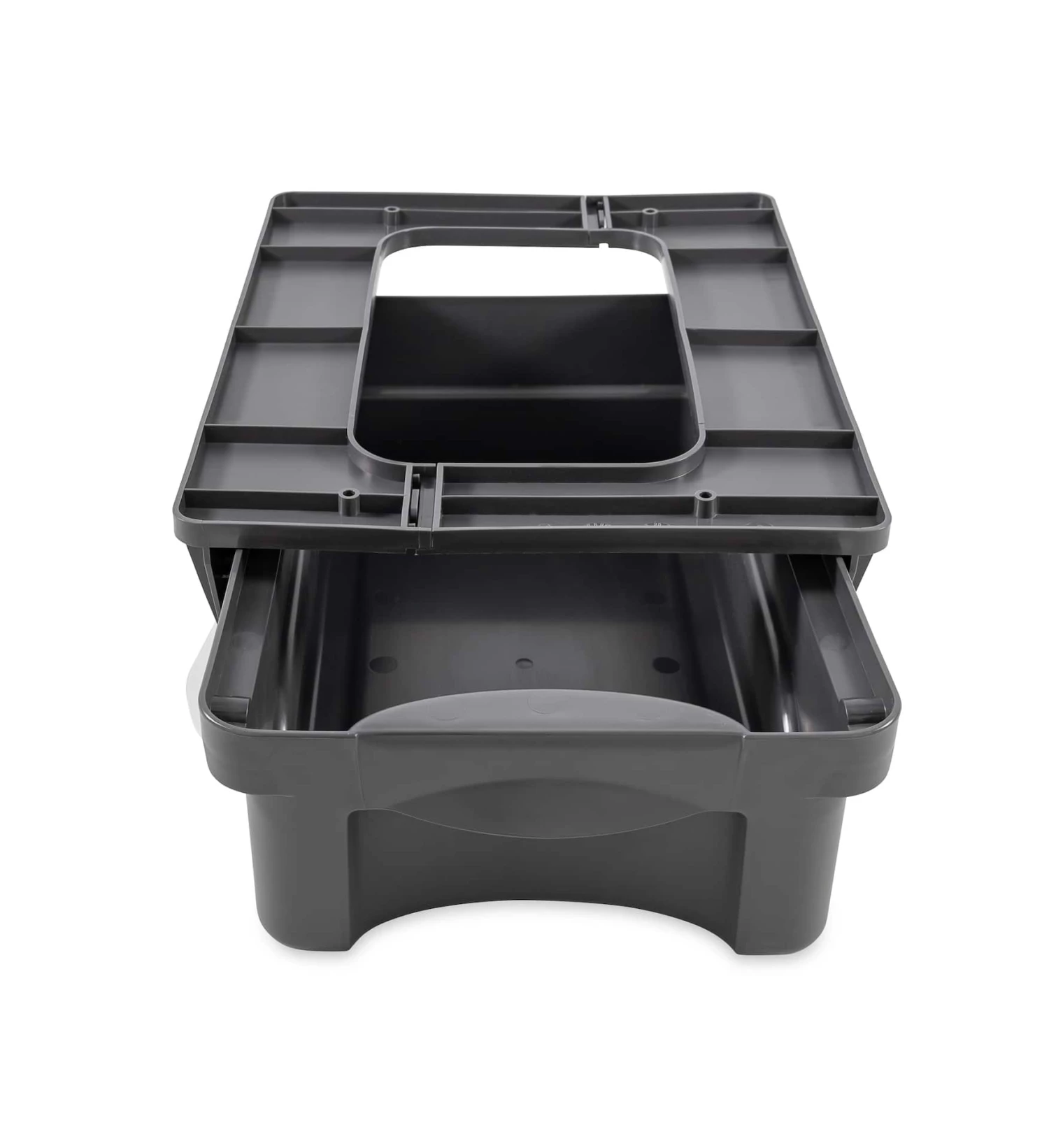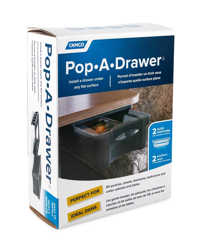 - Camco Pop-A-Drawer RV Under Cabinet Drawer features built-in locking tabs to prevent opening while traveling