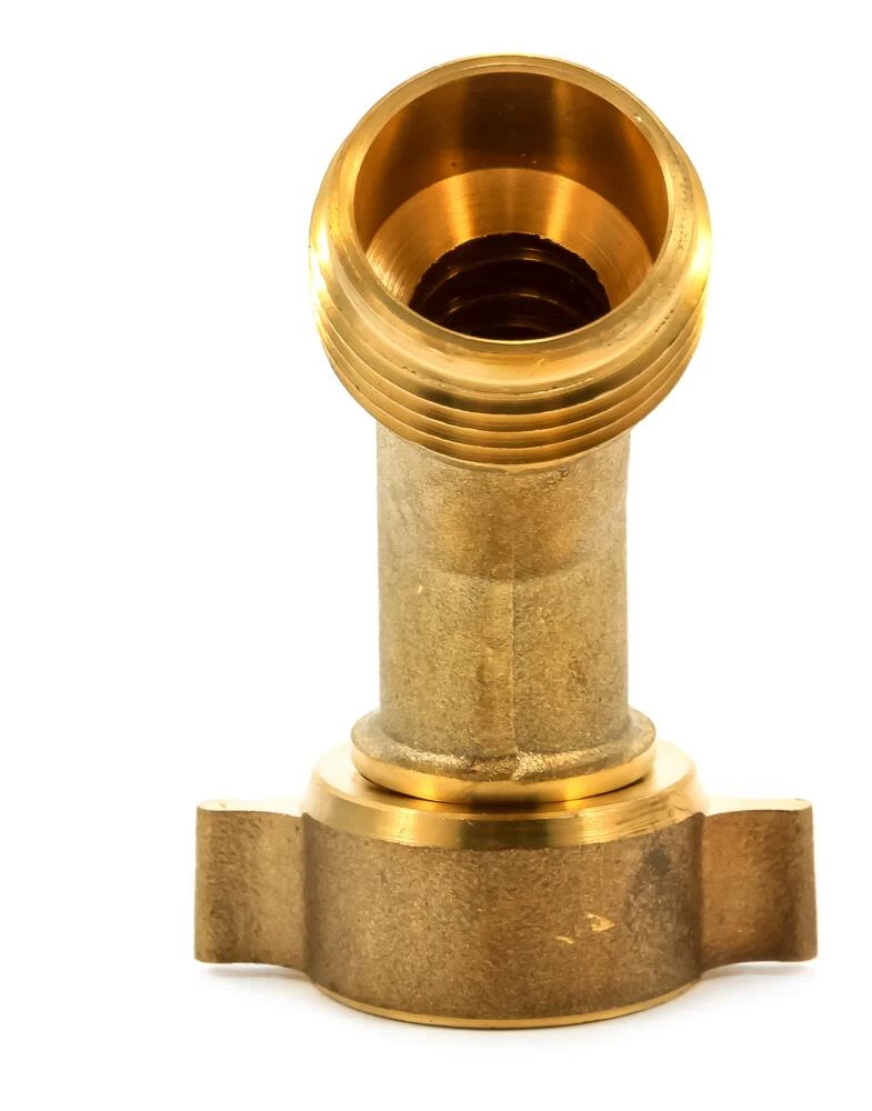 - Brass elbow with swiveling easy grip connector fits .75-11.5 NH hose connections