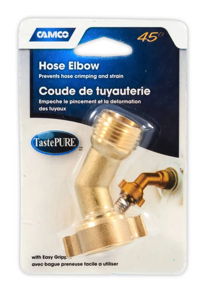 - Camco’s 45 Degree Hose Elbow can be used with water hookups to your RV, residential outdoor faucets and with washing machine hookups