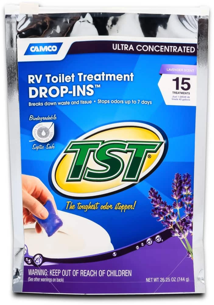 - Camco TST Lavender Drop-In Tabs Concentrated RV Holding Tank Treatment helps to break down RV black water waste and tissue while helping to control odours for a more enjoyable RV excursion