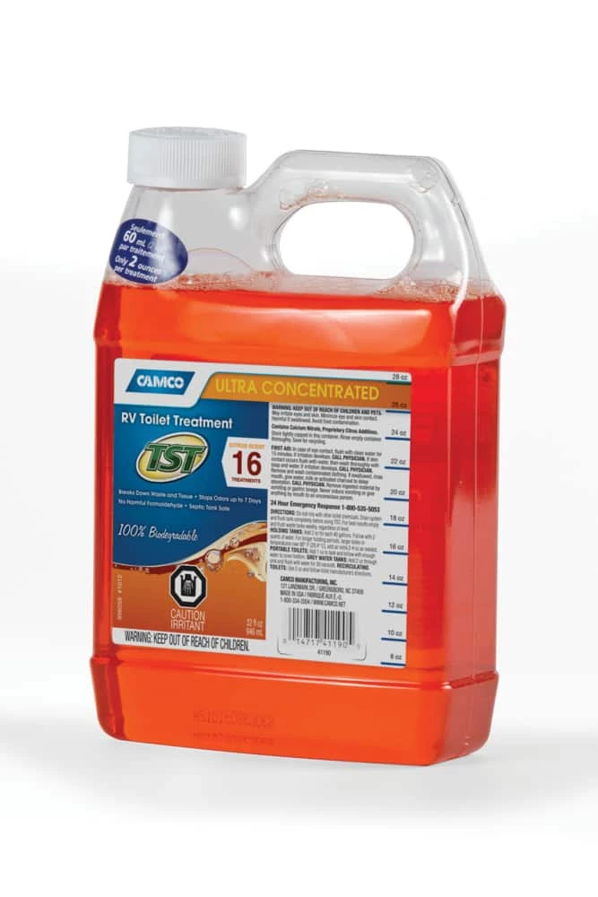 For over 40 years, RVers have trusted the odour-stopping power of Camco TST Orange Concentrated RV Holding Tank Treatment. The name still guarantees the highest quality in sanitation treatments that contain no formaldehyde, are non-staining and are safe for septic tanks