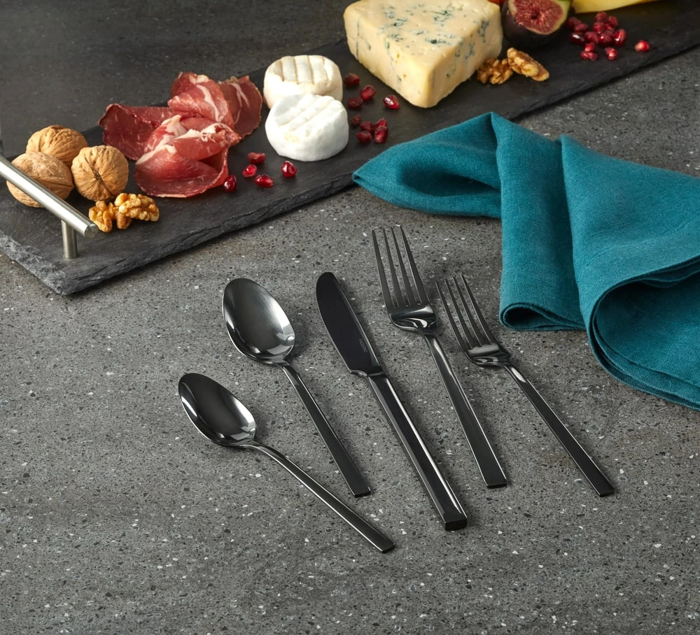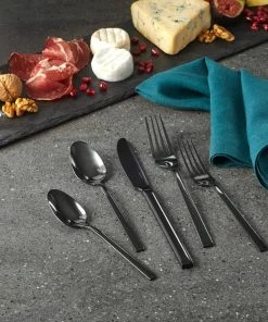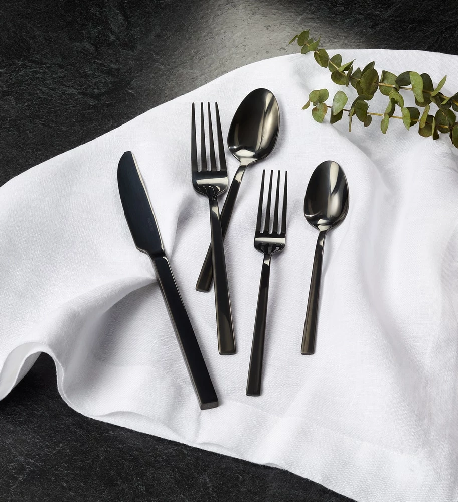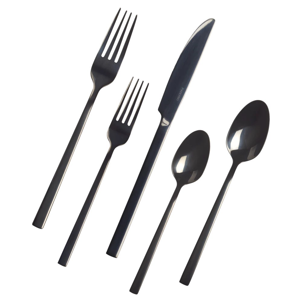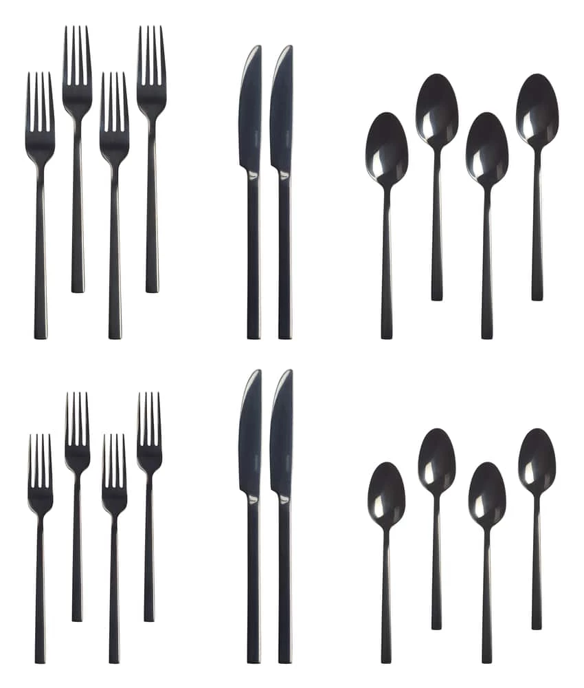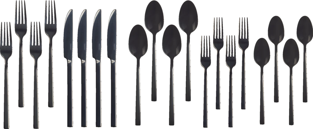 - Belvedere Black Polished Finish Flatware Set includes 4 Dinner Knives, 4 Salad Forks, 4 Dinner Forks, 4 Dinner Spoons, and 4 Teaspoons