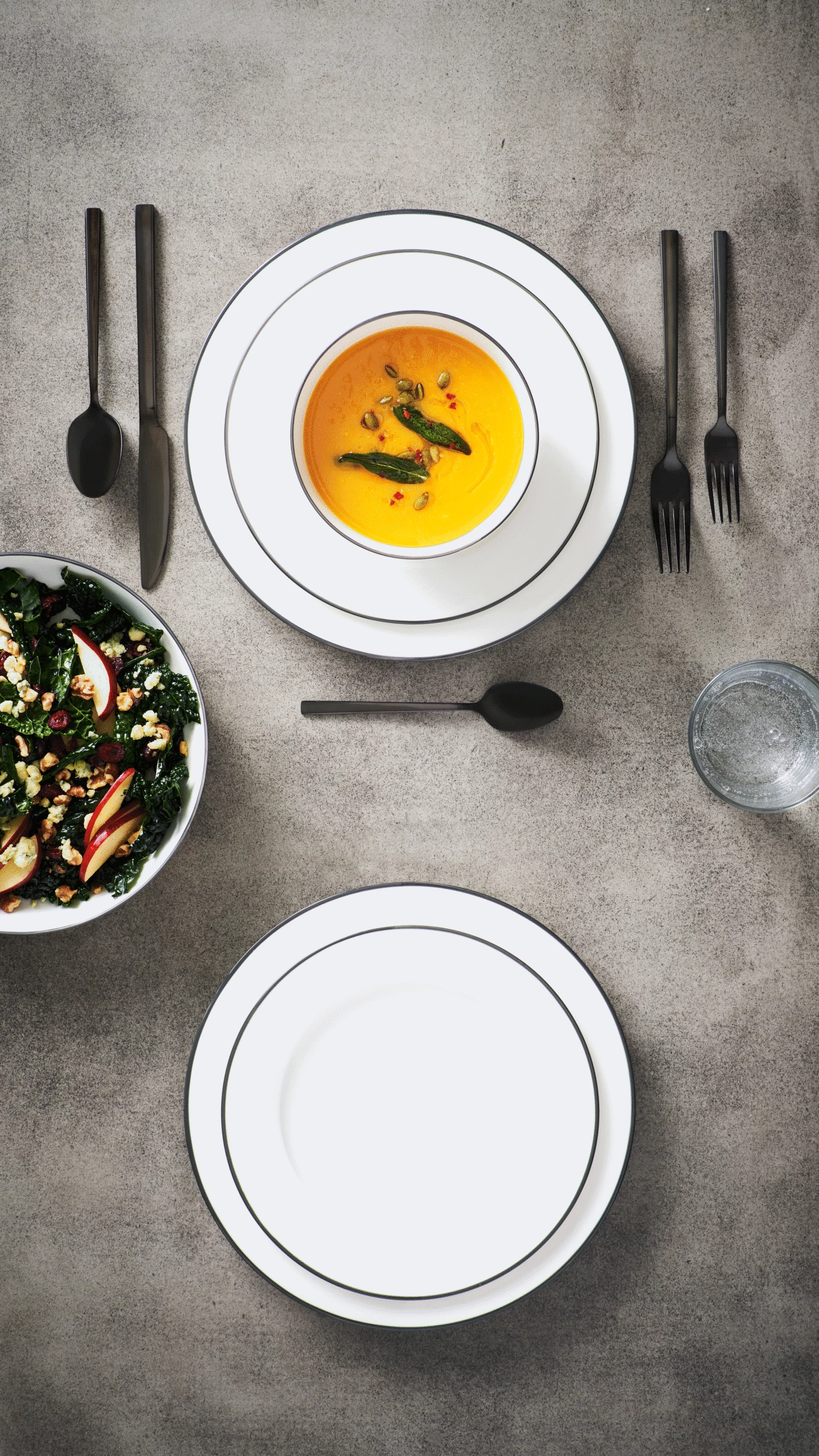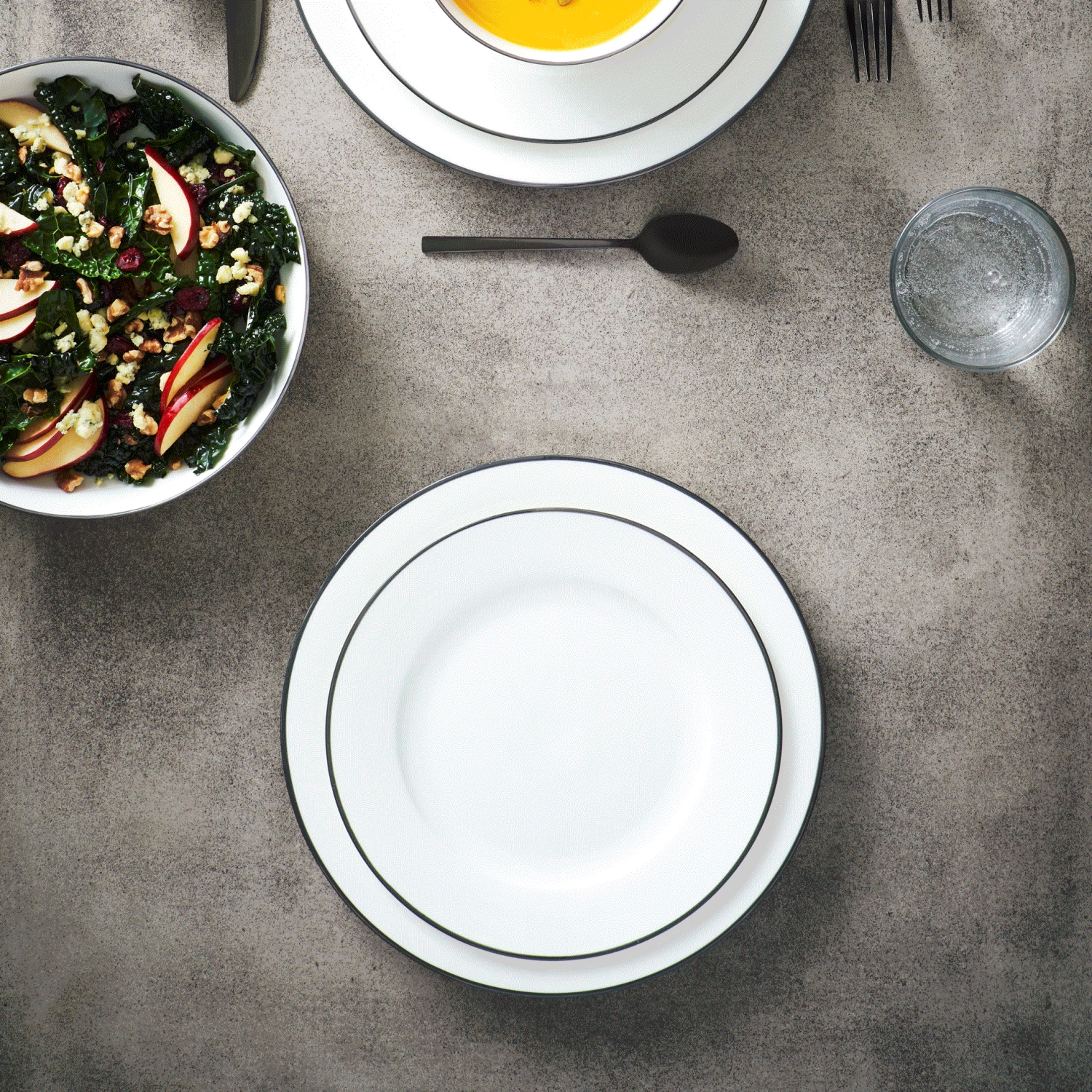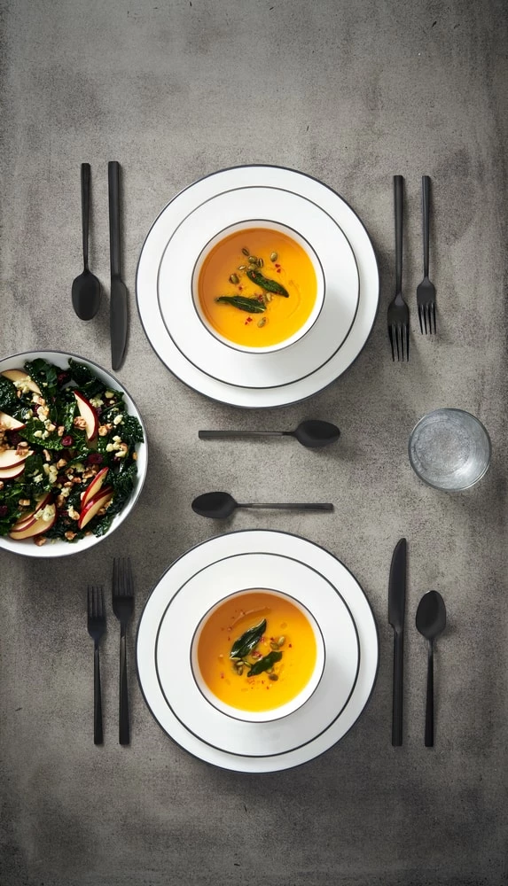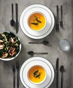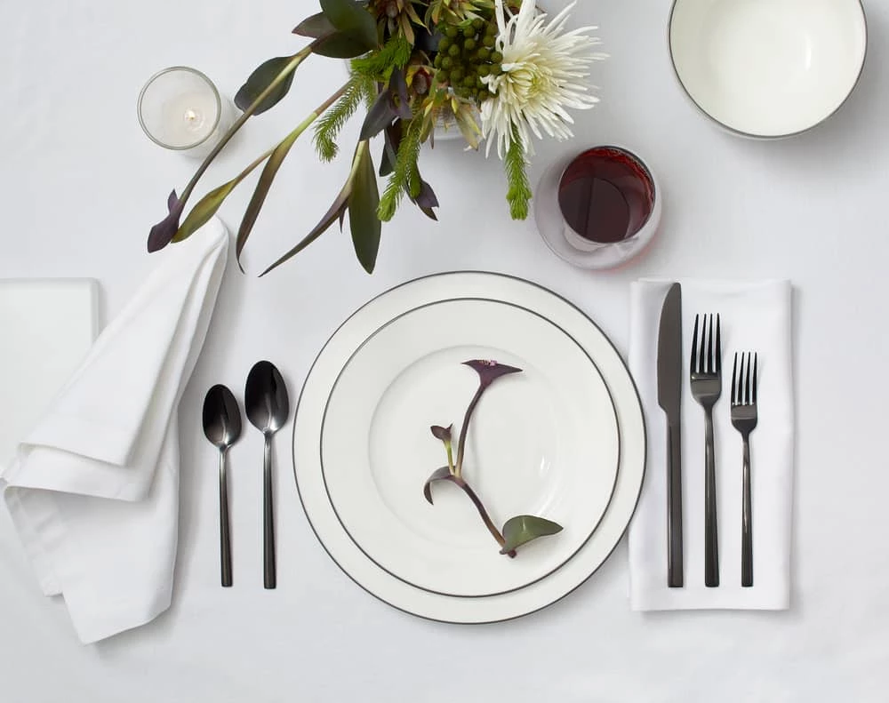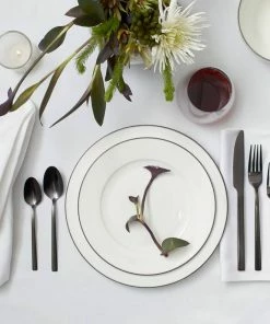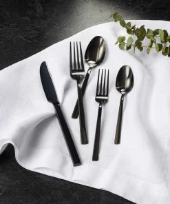 - Belvedere Black Polished Finish Flatware Set includes 4 Dinner Knives, 4 Salad Forks, 4 Dinner Forks, 4 Dinner Spoons, and 4 Teaspoons