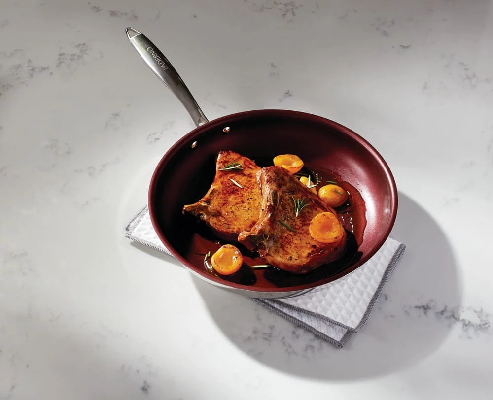 Slide food off your frying pan effortlessly with the PADERNO Canadian Signature Non-Stick Stainless Steel Frying Pan. This stainless steel cookware has many features to help make your time in the kitchen easier and even more enjoyable. Food has a very hard time sticking to the PFOA-free non-stick interior, which makes for less wasted food and a much easier time cleaning this stainless steel pan. The non-stick coating is also scratch resistant, which combined with its 18/10 stainless steel construction, provides impressive durability for years to come. This non-stick frying pan is safe for many situations, whether it’s inside your dishwasher, inside your oven up to 500°F (260°C), or on any stovetop, including induction. Proudly made in Canada, this non-stick pan is ready to be a valued addition to your Canadian kitchen.