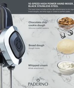 - The PADERNO 10-Speed High Power Hand Mixer features a powerful motor and multiple attachments, making a wide variety of mixing tasks faster and easier