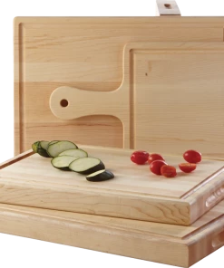 - Reversible chopping block with groove on one side for cutting and a flat surface on the other for serving
