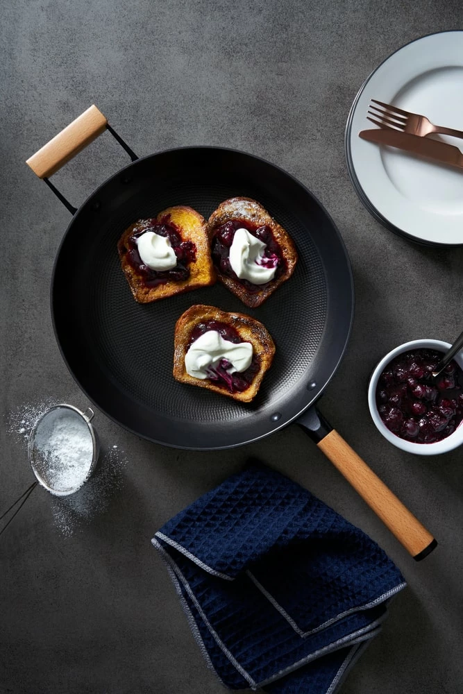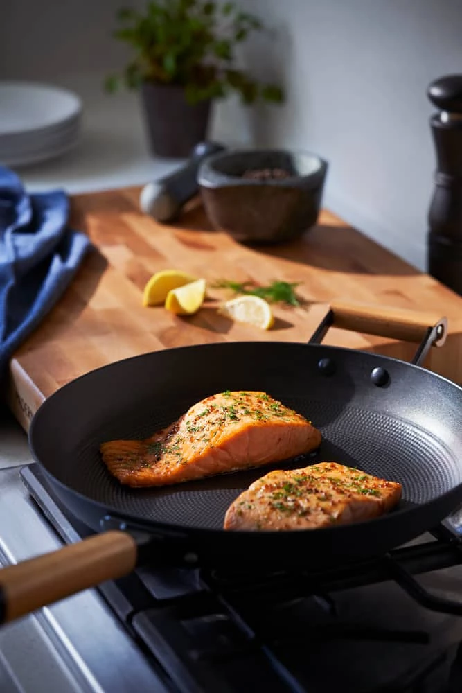 - Dimpled honeycomb surface traps oil, preventing food from touching and sticking to the bottom of the frypan, improving overall cooking performance