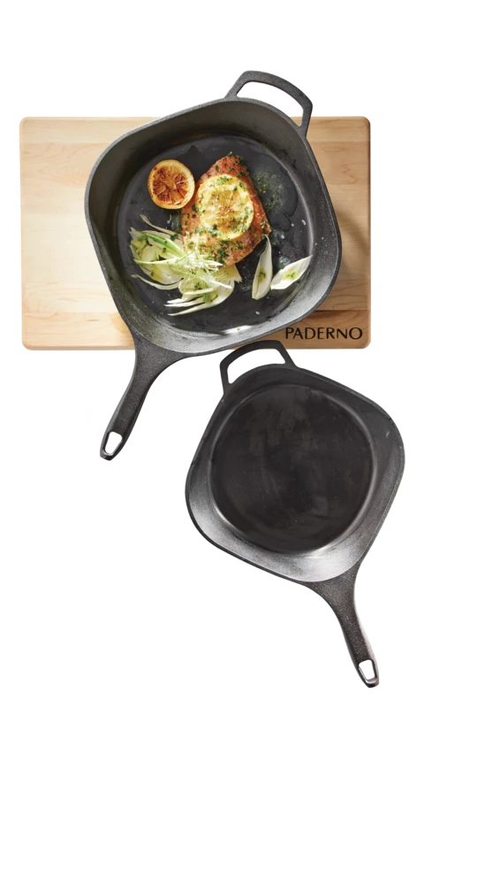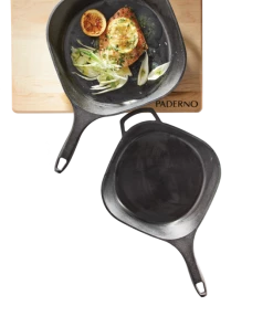 - PADERNO Pre-Seasoned Smooth-Release Cast Iron Skillet features a unique shape that allows for controlled pouring and larger capacity