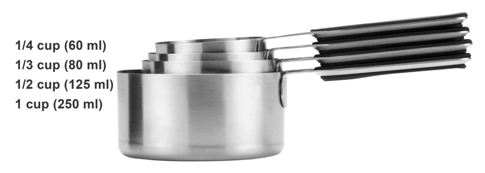 - Pieces Included: 125 mL (1/2 Cup), 250 mL (1 Cup), 60 mL (1/4 Cup), 80 mL (1/3 Cup)